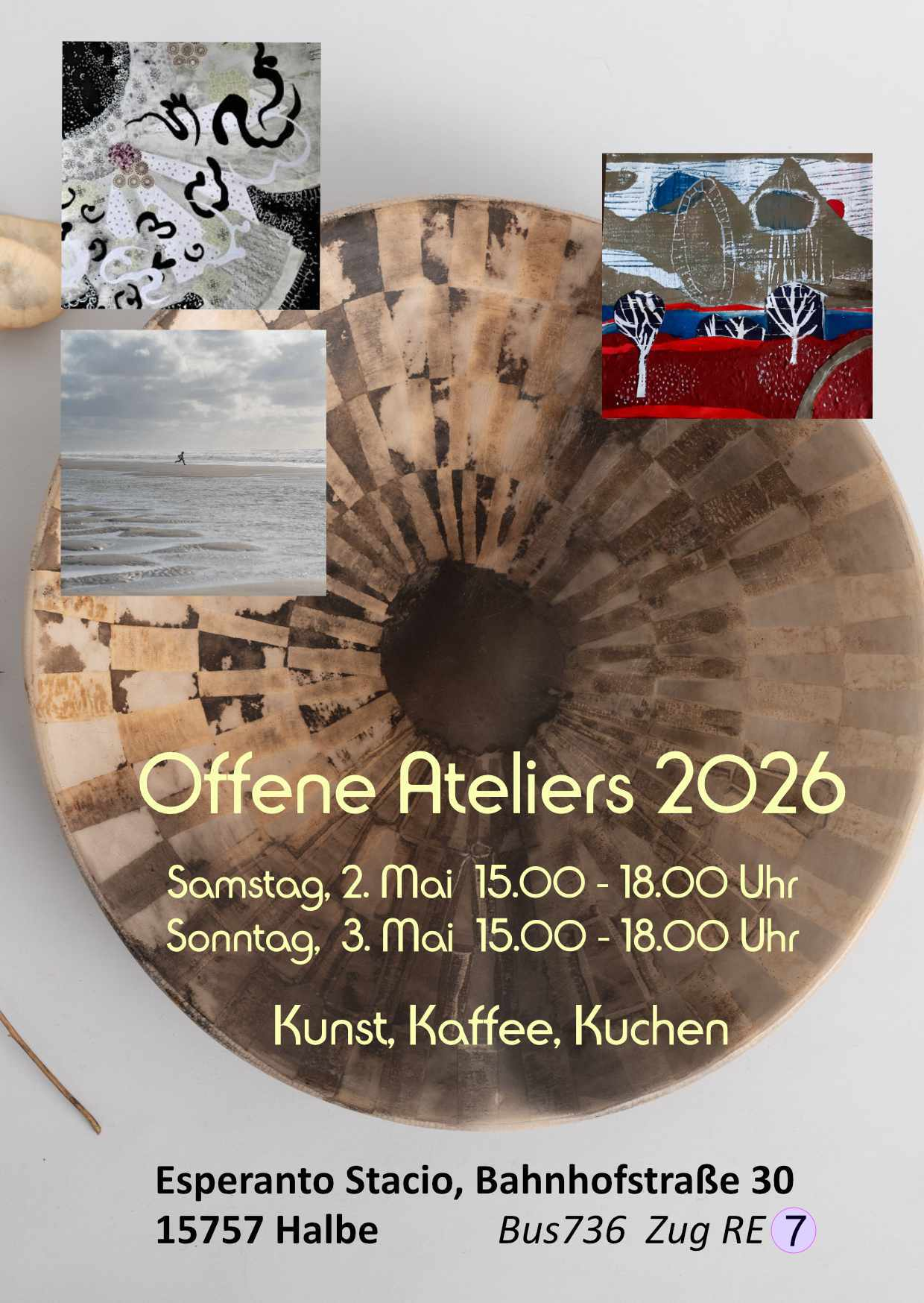 Offenes Atelier Autor des Beitrags Von Susanne Thäsler-Wollenberg Datum des Beitrags 26. Februar 2026 Startdatum: 2. Mai 2026Enddatum: 3. Mai 2026Uhrzeit: 15:00 - 18:00Veranstaltende: Halbe.Welt e.V.Austellungen